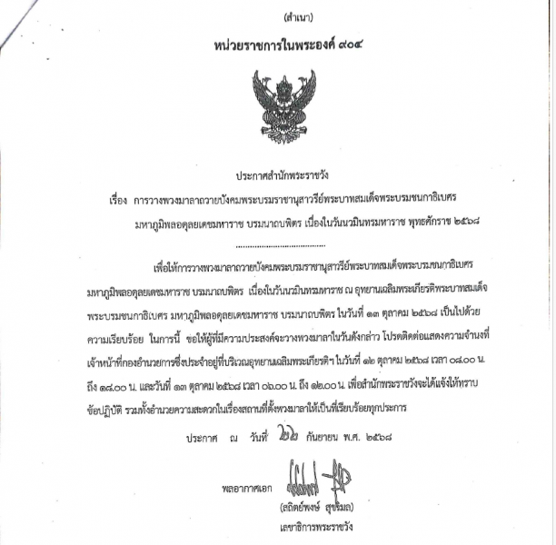 ประกาศสำนักพระราชวัง เรื่อง การวางพวงมาลาถวายบังคมพระบรมราชานุสาวรีย์พระบาทสมเด็จพระบรมชนกาธิเบศ มหาภูมิพลอดุลยเดชมหาราช บรมนาถบพิตร เนื่องในวันนวมินทรมหาราช พุทธศักราช ๒๕๖๘