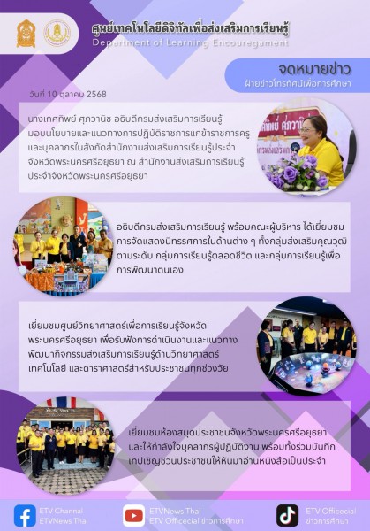 - ดร.เกศทิพย์ ศุภวานิช อธิบดีกรมส่งเสริมการเรียนรู้ มอบนโยบายและแนวทางการปฏิบัติราชการแก่ข้าราชการครูและบุคลากรในสังกัดสำนักงานส่งเสริมการเรียนรู้ประจำจังหวัดพระนครศรีอยุธยา ณ สำนักงานส่งเสริมการเรียนรู้ประจำจังหวัดพระนครศรีอยุธยา
