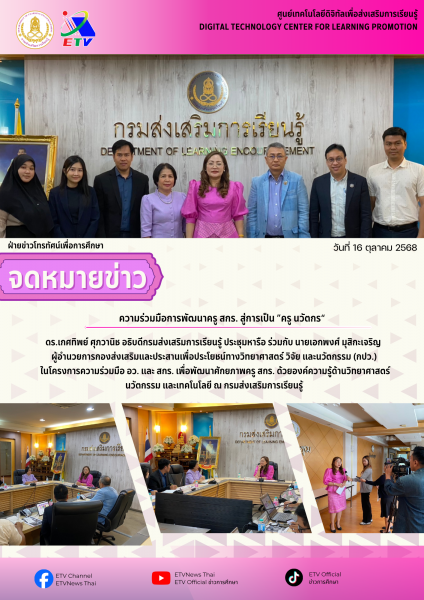 - ดร.เกศทิพย์ ศุภวานิช อธิบดีกรมส่งเสริมการเรียนรู้ ประชุมหารือร่วมกับ นายเอกพงศ์ มุสิกะเจริญ ผอ.กองส่งเสริมและประสานงานเพื่อประโยชน์ทางวิทยาศาสตร์ วิจัย และนวัตกรรม(กปว.) เพื่อพัฒนาครู สกร. สู่การเป็น "ครู นวัตกร"