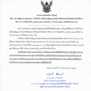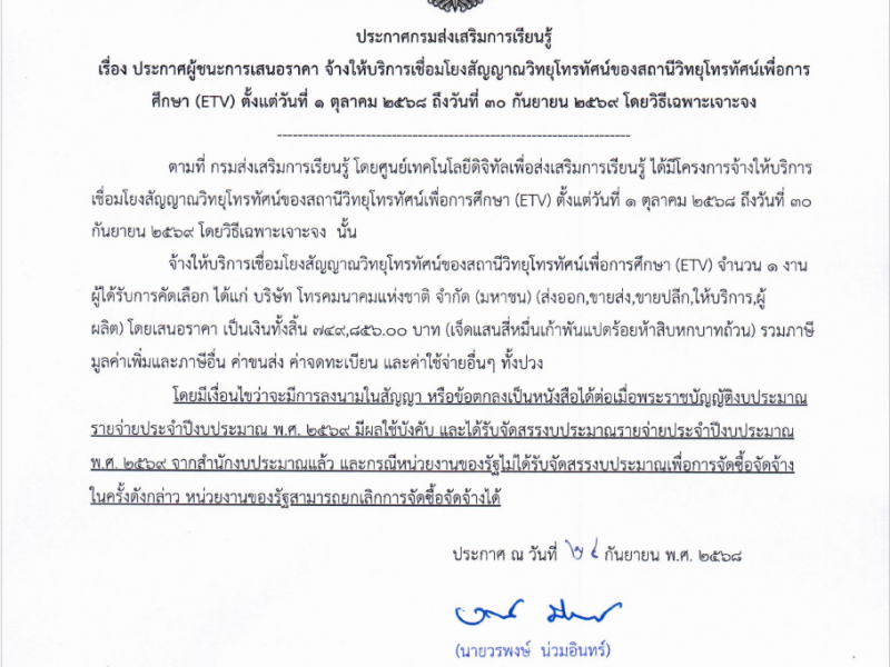 ประกาศผู้ชนะการเสนอราคา จ้างให้บริการเชื่อมโยงสัญญาณวิทยุโทรทัศน์ของสถานีวิทยุโทรทัศน์เพื่อการศึกษา (ETV) ตั้งแต่วันที่ 1 ตุลาคม 2568 ถึงวันที่ 30 กันยายน 2569 โดยวิธีเฉพาะเจาะจง